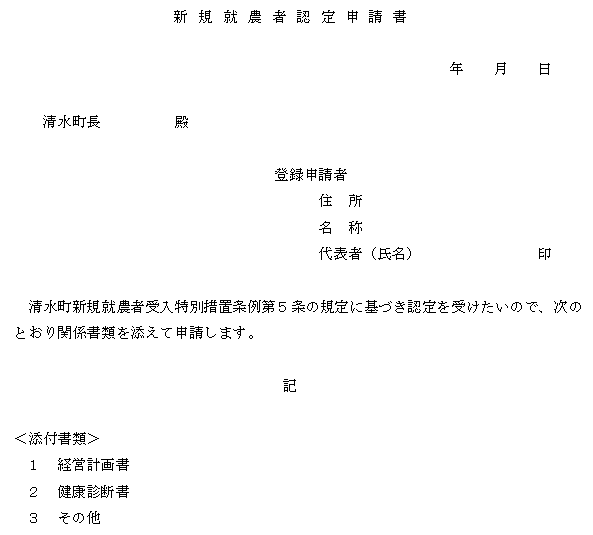 別記第3号様式の認定申請書を十勝清水町農業協同組合を経由し、町長に提出しなければならない。