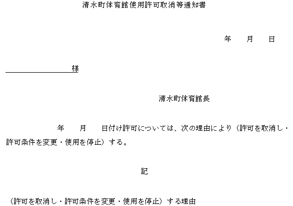条例第7条第1項の規定により許可の取消し、許可に係る条件の変更又は当該使用の中止をするときは、遅滞なく、清水町体育館使用許可取消等通知書(