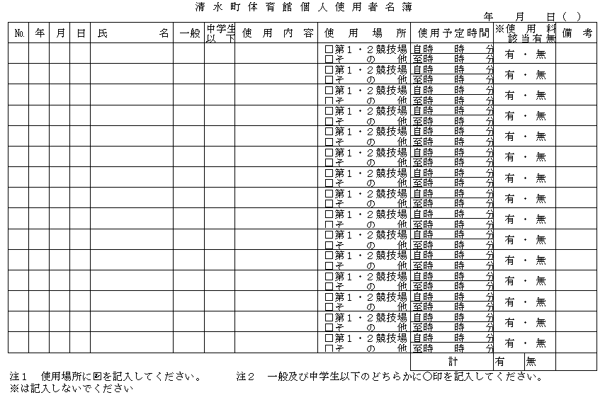 第8条 体育館を個人で使用しようとする者は、使用当日、清水町体育館個人使用者名簿(