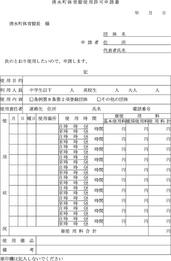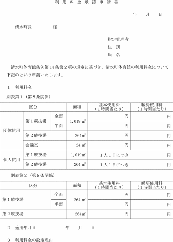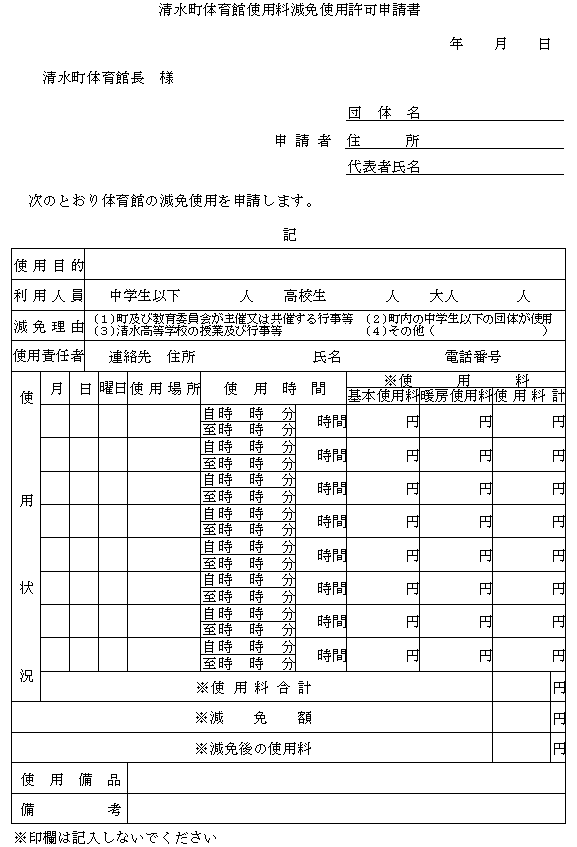 2 使用料の減免を受けようとする者は、清水町体育館使用料減免使用許可申請書(
