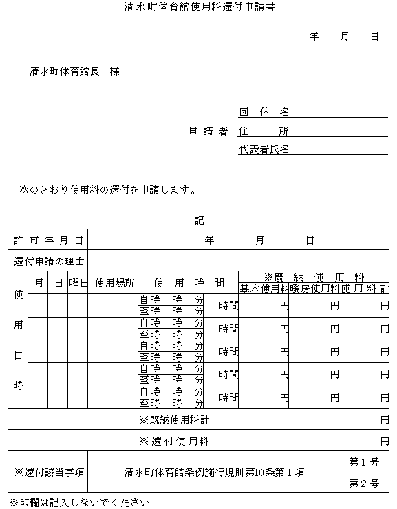 2 前項の規定により使用料の全部又は一部の還付を受けようとする者は、清水町体育館使用料還付申請書(