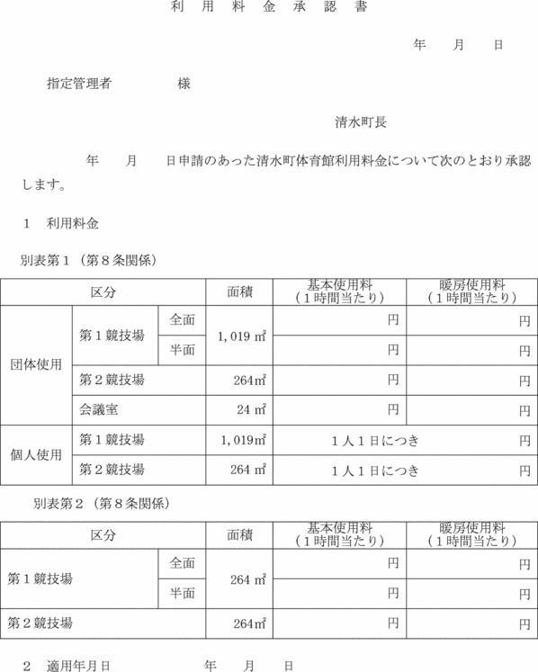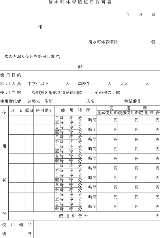 第5条 館長は、前条第1項の規定により提出された申請書に係る申請事項について許可するときは、清水町体育館使用許可書(
